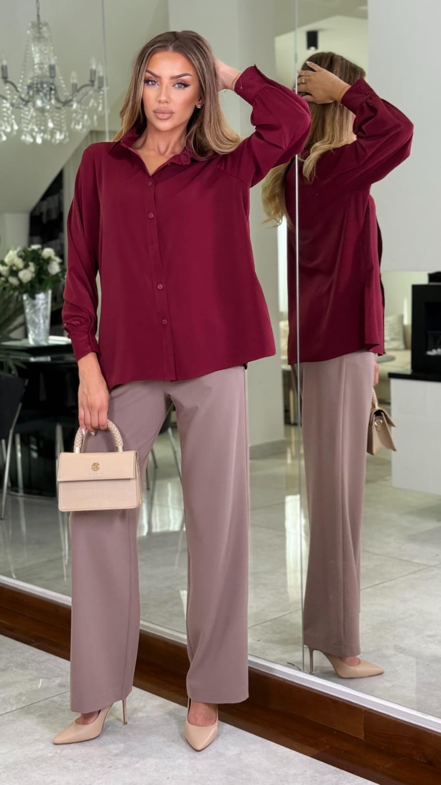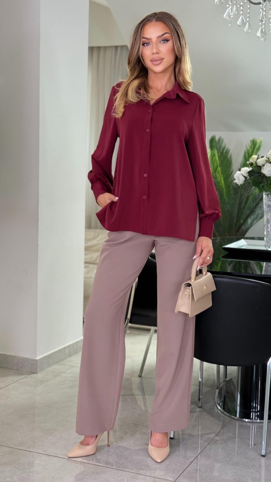 Elegancka, zwiewna i stylowa. Bluzka koszulowa Bordeaux Classy w głębokim odcieniu burgundu to idealny wybór do pracy, na spotkania i codzienne stylizacje premium. W celu dobrania idealnego rozmiaru prosimy o podanie w uwagach obwodu biustu.