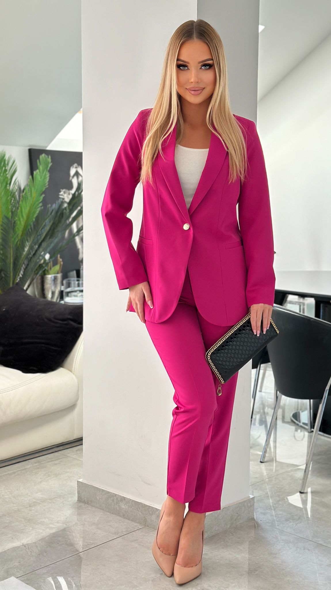 Wyobraź sobie, że wchodzisz do pomieszczenia, a wszystkie spojrzenia kierują się na Ciebie. Nie dlatego, że chcesz zwracać na siebie uwagę, ale dlatego, że emanujesz klasą, pewnością siebie i siłą. Ten garnitur to coś więcej niż ubranie – to Twoja tajna broń, gdy chcesz czuć się niezłomna, elegancka i gotowa na każde wyzwanie.