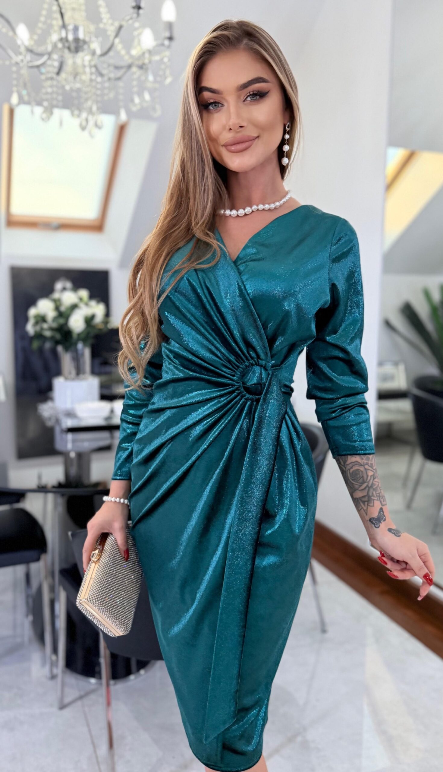 Elegancka sukienka midi w kolorze szlachetnej zieleni z dopracowanym drapowaniem i delikatnym połyskiem. Doskonała na święta, sylwester i eleganckie wyjścia. Regulowana w obwodzie talii, dzięki czemu zapewnia komfort podczas noszenia.
