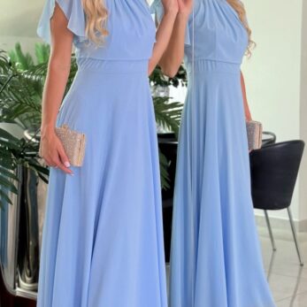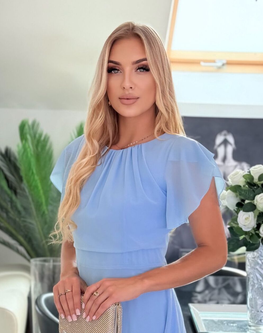 Wykonana z subtelnego, szlachetnego szyfonu w odcieniu pudrowego błękitu, delikatnie otula ciało, nadając sylwetce lekkości i klasy.