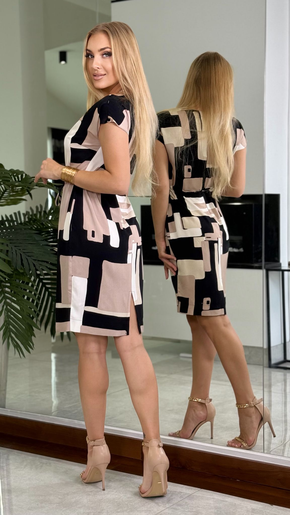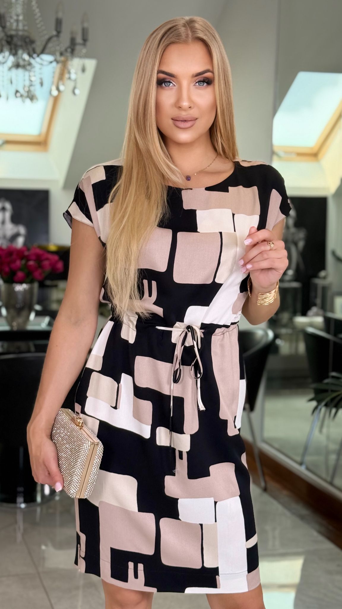 „City Chic” to sukienka, która idealnie wpisuje się w aktualne trendy – dynamiczny print inspirowany miejską architekturą, klasyczna paleta barw i kobiecy krój, który podkreśla sylwetkę bez zbędnego wysiłku.