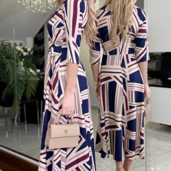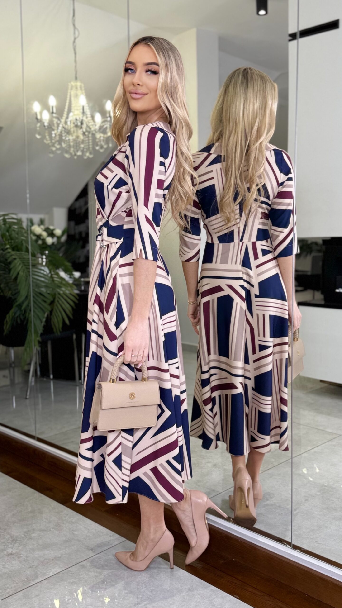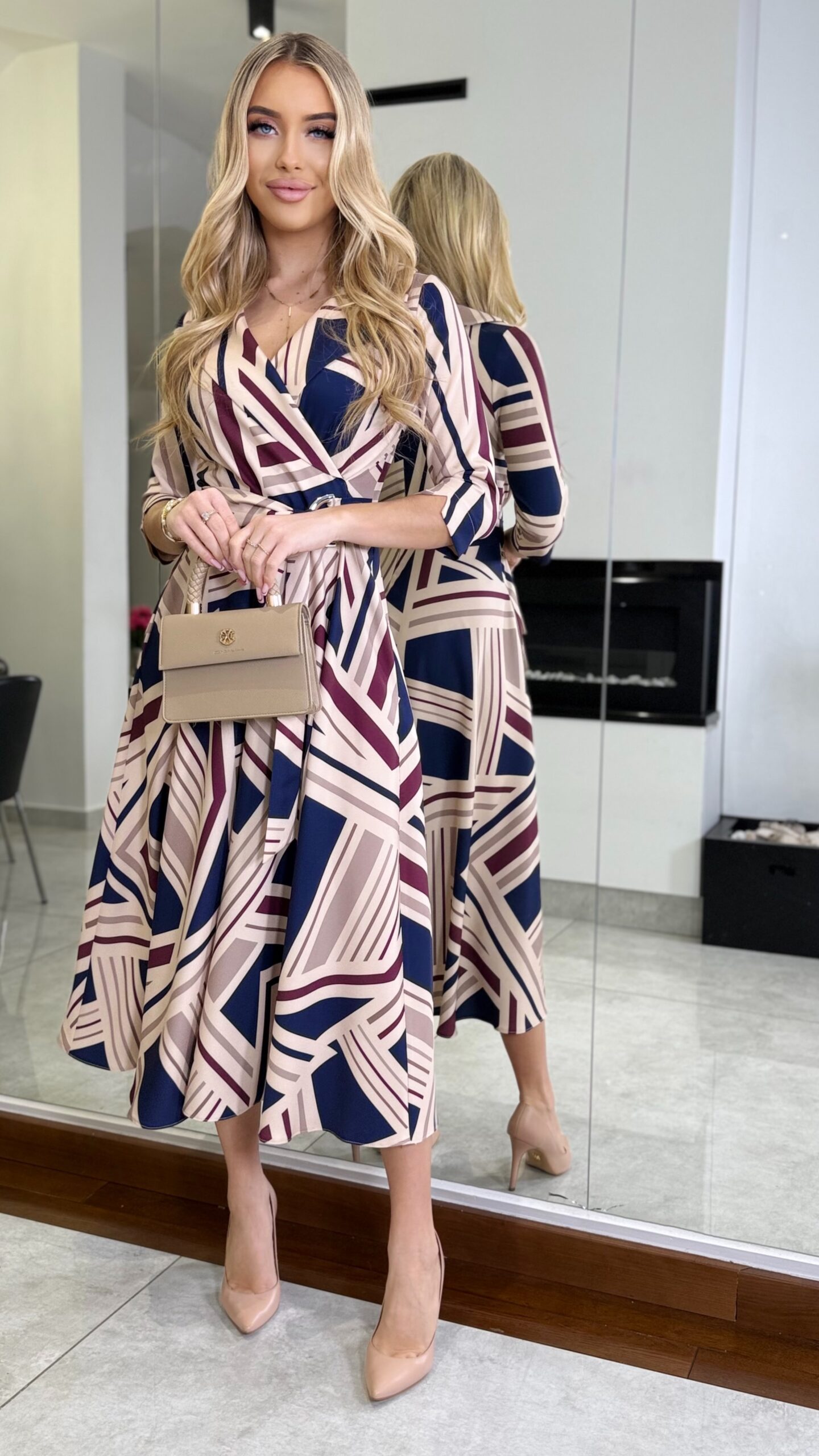 Elegancka sukienka midi z nowoczesnym geometrycznym wzorem, utrzymana w stonowanej palecie beżu, granatu i bordo. Klasyczna forma z regulowaną talią.
