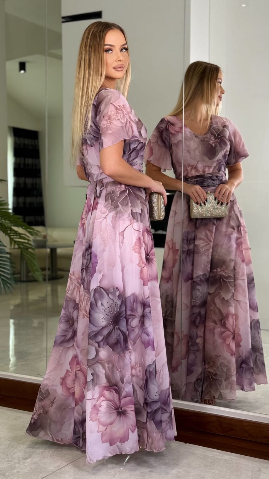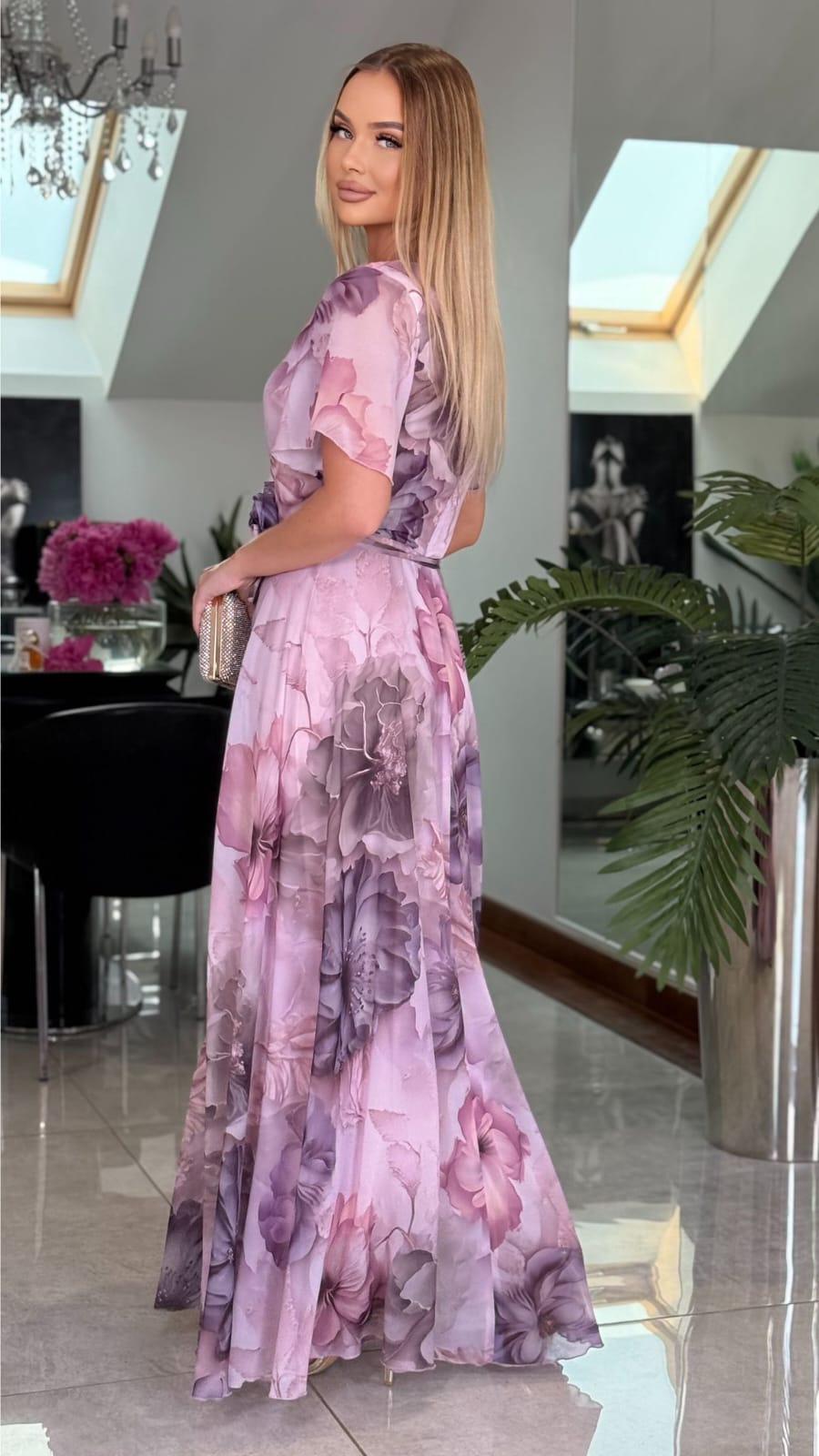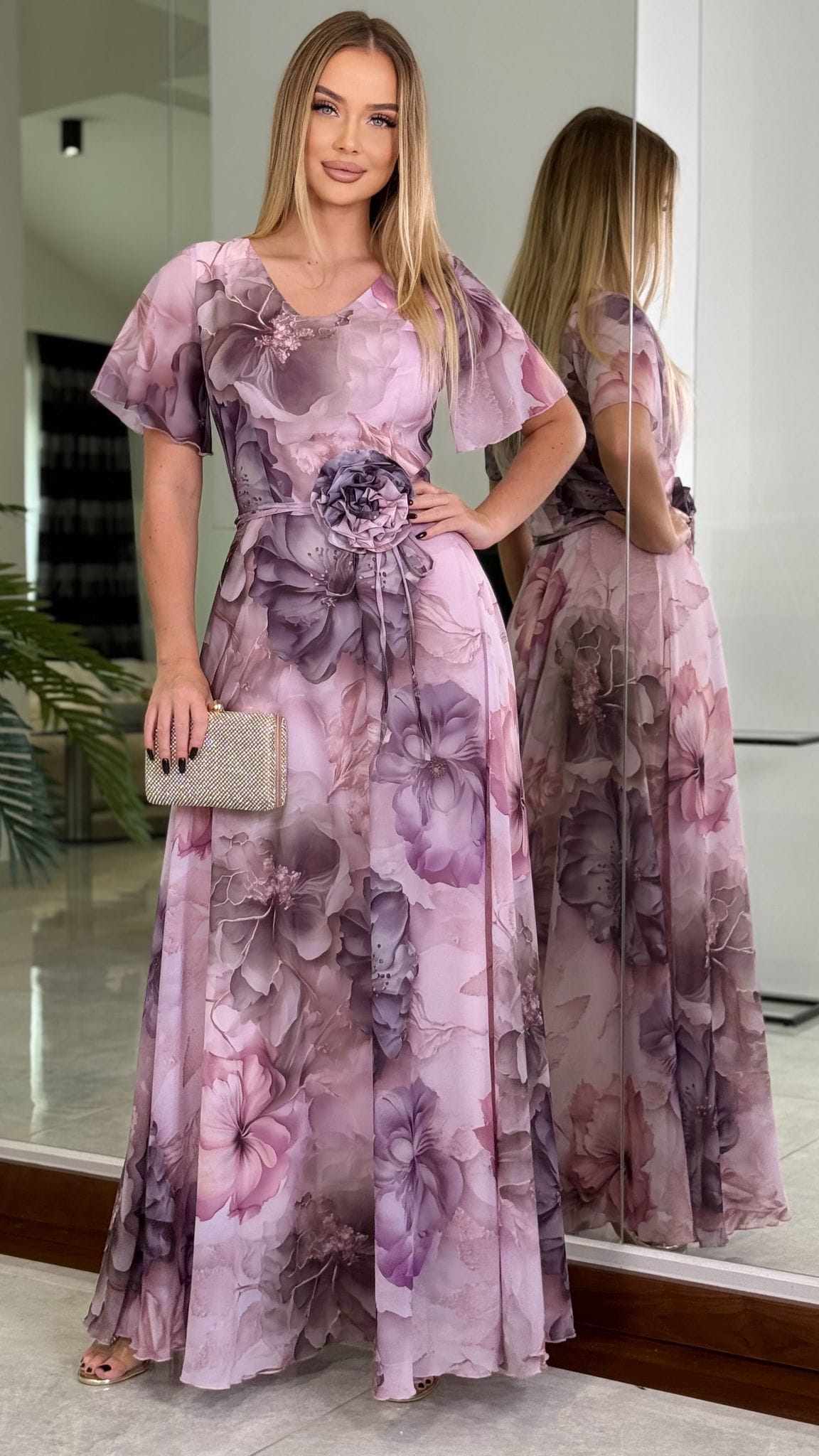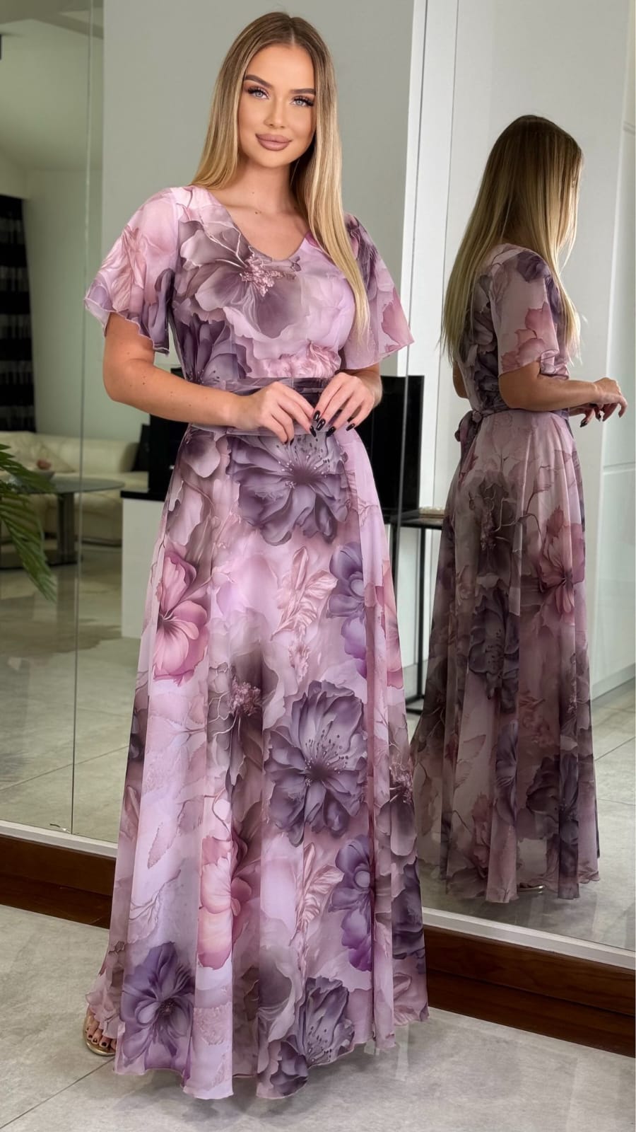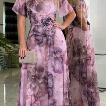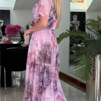 Jej kwiatowy, pastelowy print w odcieniach pudrowego różu i lawendy nadaje sylwetce subtelności i wdzięku, a zwiewny krój z delikatnym paskiem w talii pięknie podkreśla kobiece kształty.