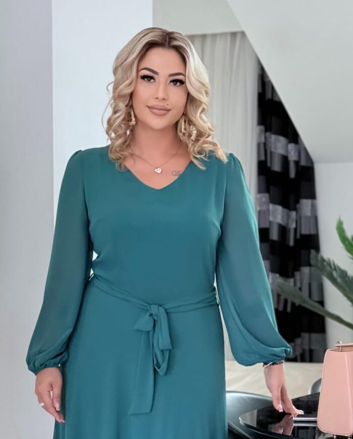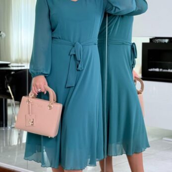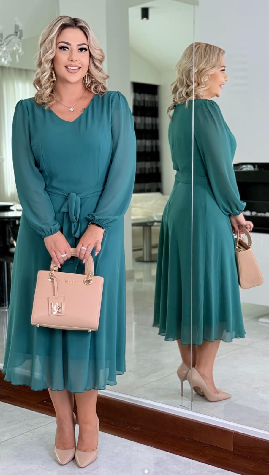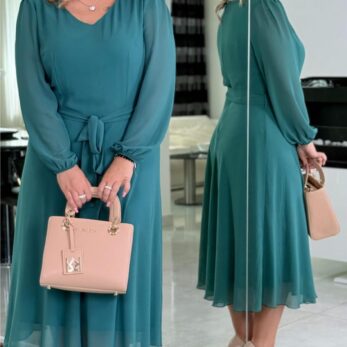 🌿 Krój: długość midi, dekolt V, pasek w talii