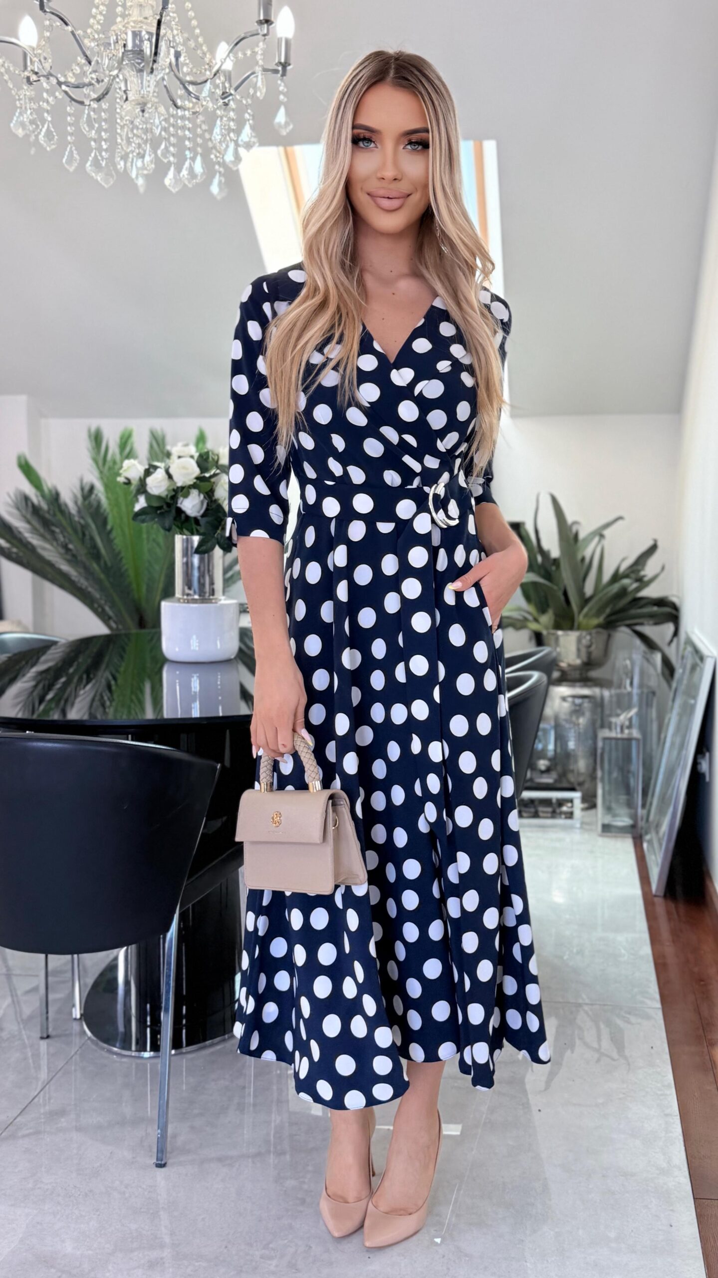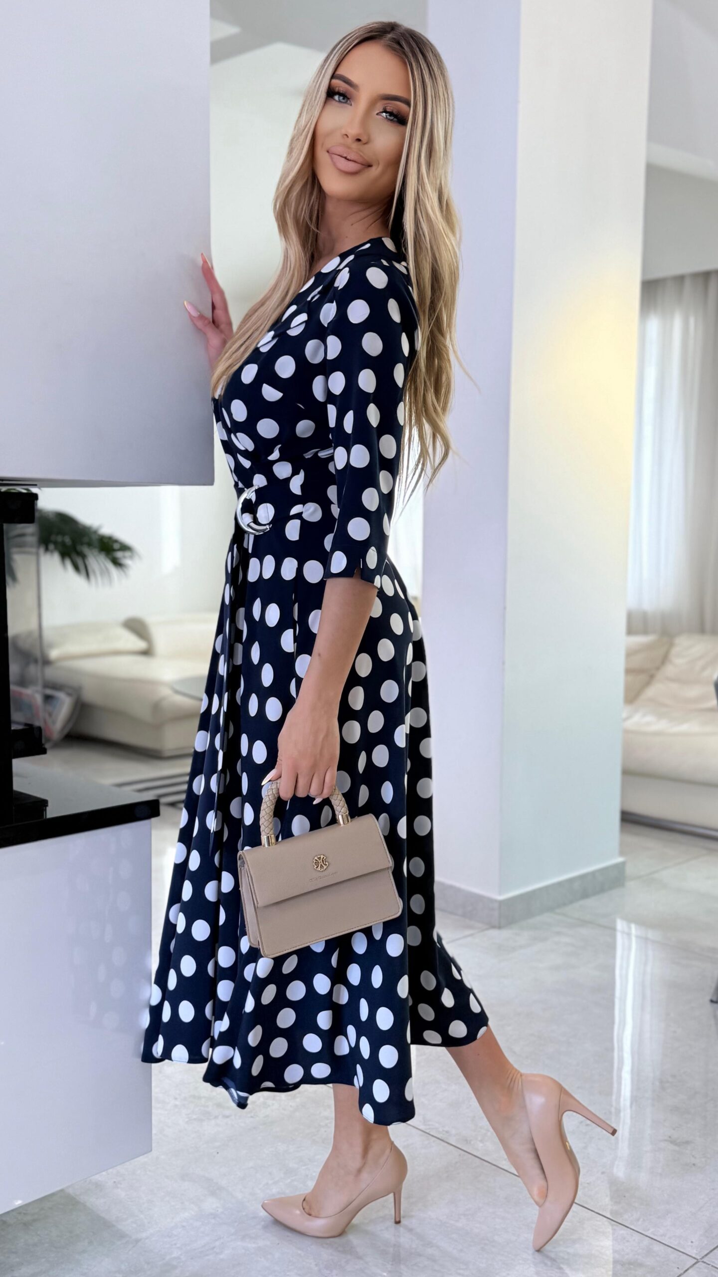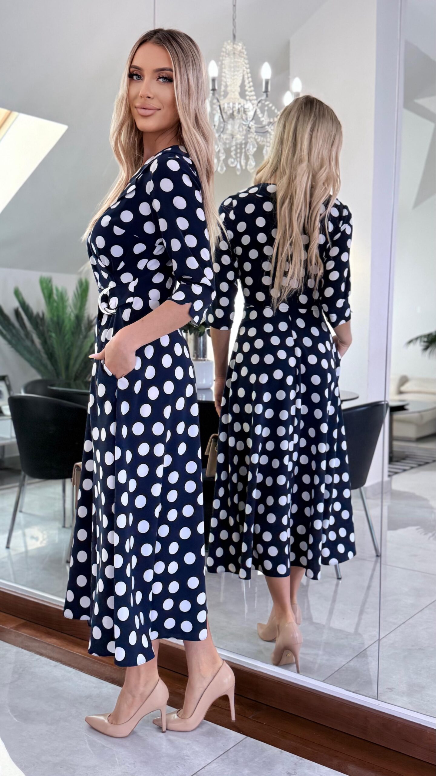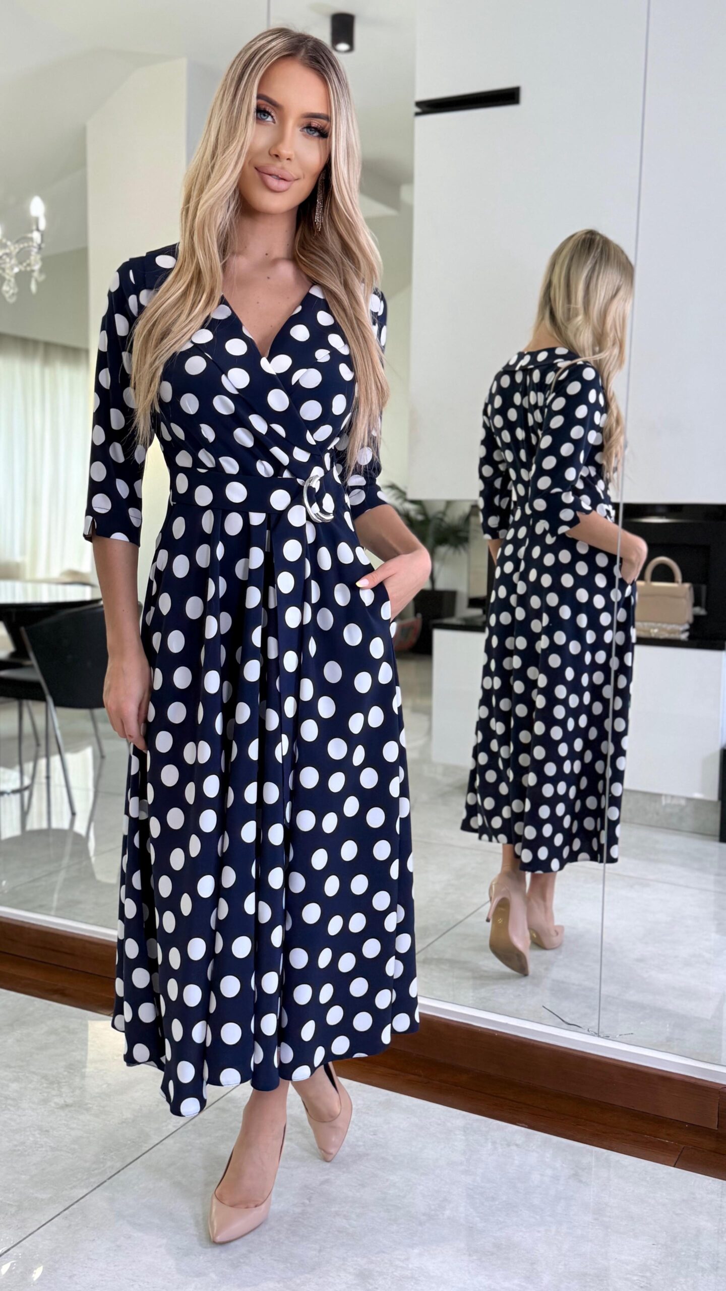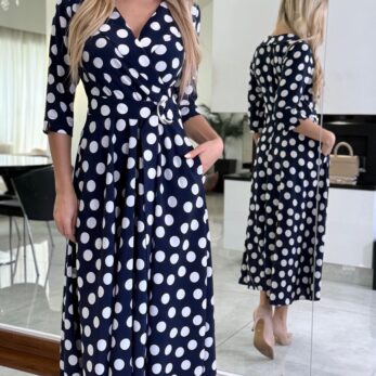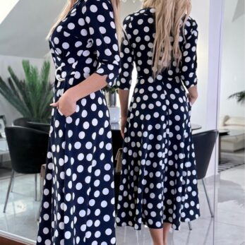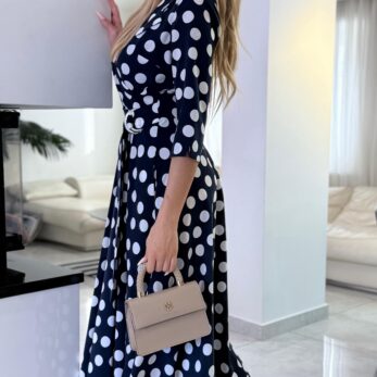 Sukienka Navy Polka Classic to ponadczasowa propozycja inspirowana klasyczną kobiecą elegancją. Granatowa baza zestawiona z kontrastowym wzorem białych groszków tworzy harmonijną, wyważoną całość, która doskonale wpisuje się zarówno w styl codzienny, jak i bardziej eleganckie okazje.