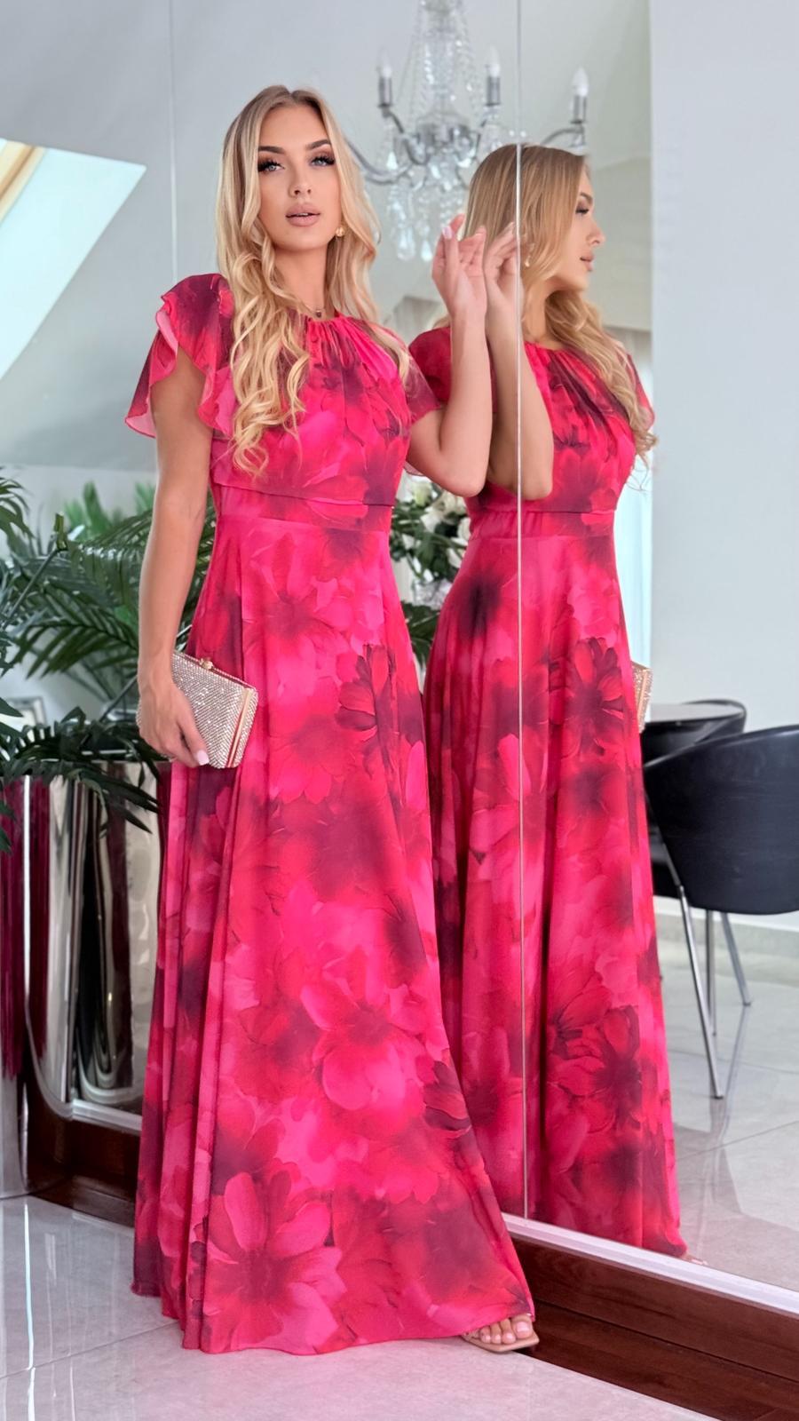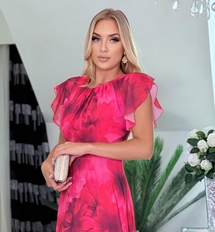 Model przyciąga uwagę delikatnie marszczonym dekoltem oraz efektownymi, zwiewnymi rękawkami typu motylek, które dodają całej stylizacji lekkości i romantyzmu. Rozkloszowany fason z zaznaczoną talią pięknie modeluje sylwetkę i zapewnia swobodę ruchów. Idealna na wesela, przyjęcia, uroczystości rodzinne czy wieczorne wyjścia.